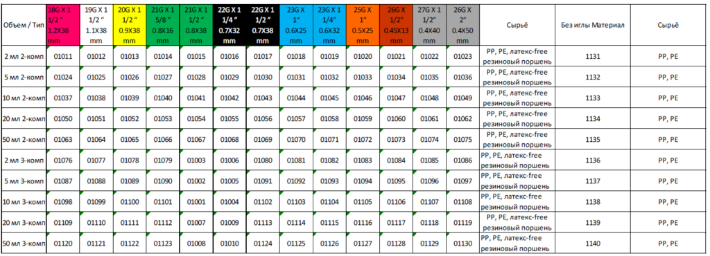 Материалы: медицинский полипропилен, резиновые колпачки без содержания латекса, формованные поршни и корпуса, укомплектованные прокладками. После производства иглы проходят стерилизацию этиленоксидом. Для получения информации о ценах и подробных характеристиках шприцев для вакцинации — свяжитесь с нами.Перейдите по ссылке, чтобы ознакомиться с шприцем объёмом 1 мл.